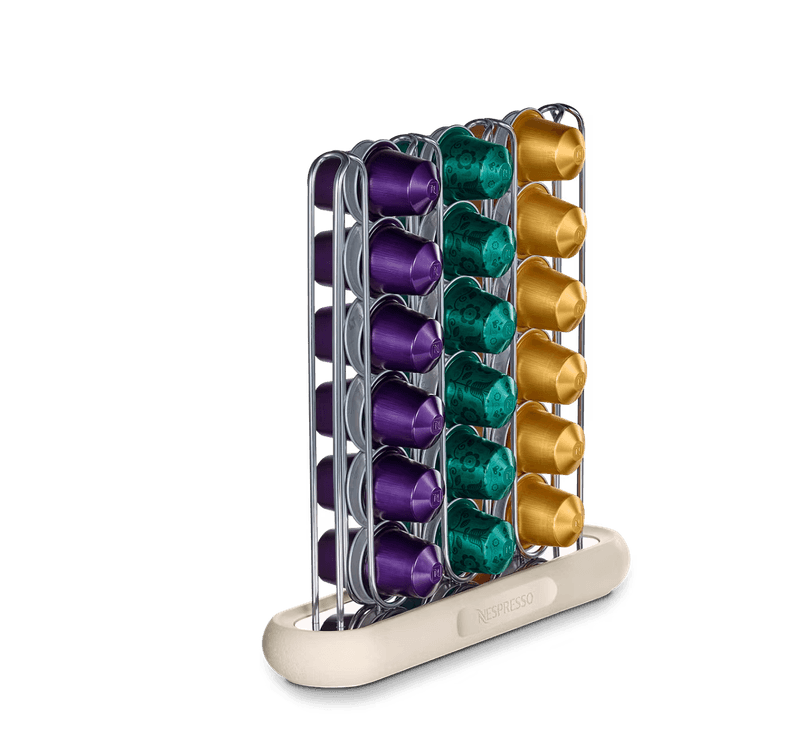 Eleva tu experiencia Nespresso con el elegante dispensador de cápsulas Vertical. Con rieles de acero inoxidable y una base de travertino sintético, este dispensador es ideal para almacenar tus cápsulas Nespresso favoritas. Su tamaño compacto se adapta fácilmente a cualquier cocina agregando un toque de elegancia a tu coffee corner. Para limpiarlo, solo basta un paño suave humedecido con agua tibia.