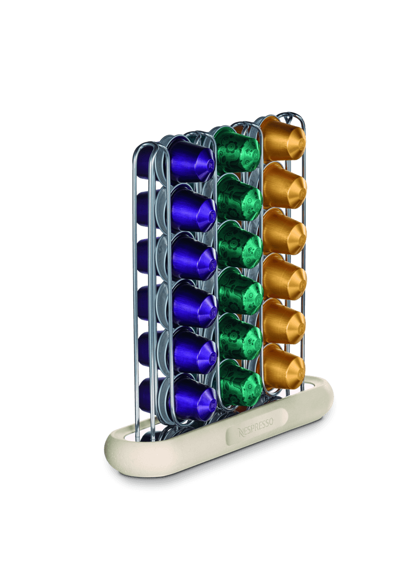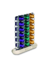 Elaborado por la reconocida diseñadora italiana Federica Biasi, este elegante dispensador cuenta con rieles de acero inoxidable y una base de travertino sintético. Perfecto para guardar y ordenar tus cápsulas Nespresso favoritas. Su tamaño compacto se adapta fácilmente a cualquier espacio, agregando un toque elegante a tu rincón de café.